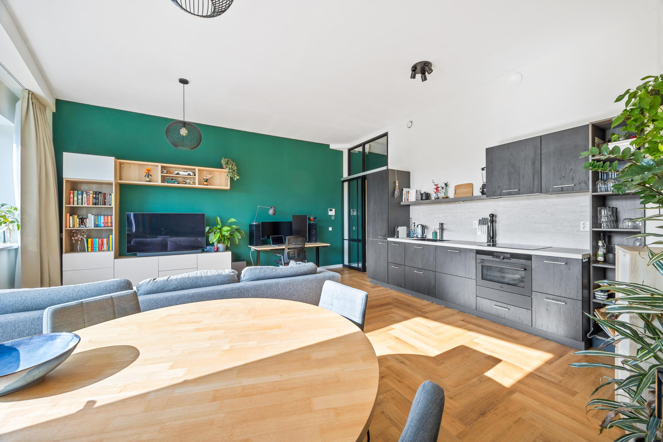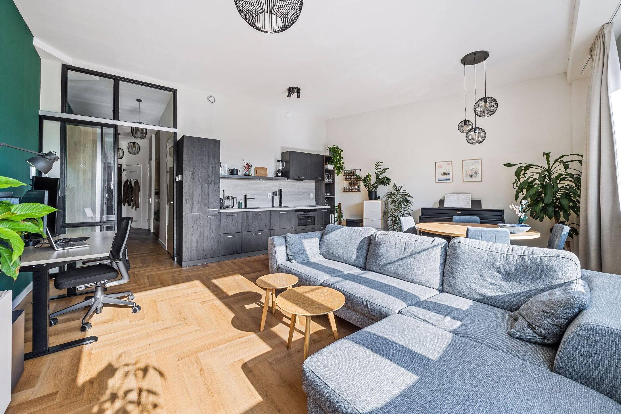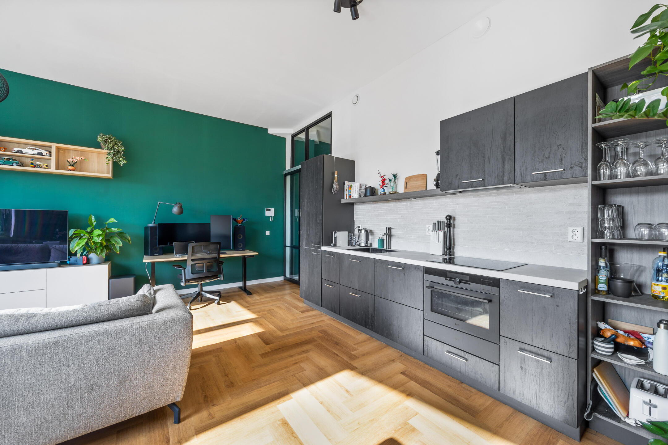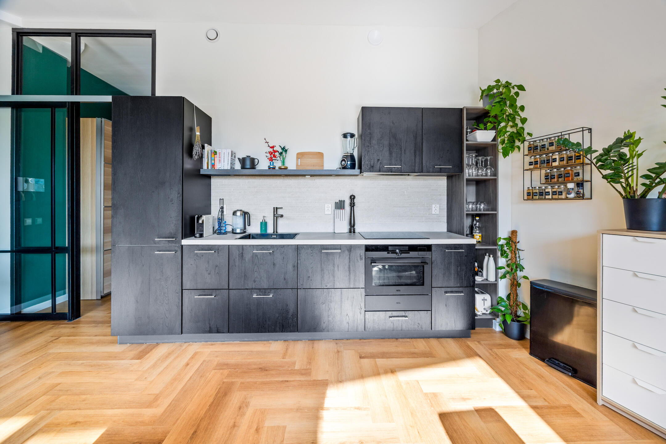 Daarnaast zorgen de vijf zonnepanelen voor een lage energierekening. De woning is volledig afgewerkt met een visgraat PVC-vloer met comfortabele vloerverwarming. Moderne Voorzieningen De moderne open keuken is voorzien van hoogwaardige inbouwapparatuur en de luxe badkamer is stijlvol afgewerkt. De royale plafondhoogte van 3,20 meter, zorgt voor een ruimtelijk en stijlvol effect.